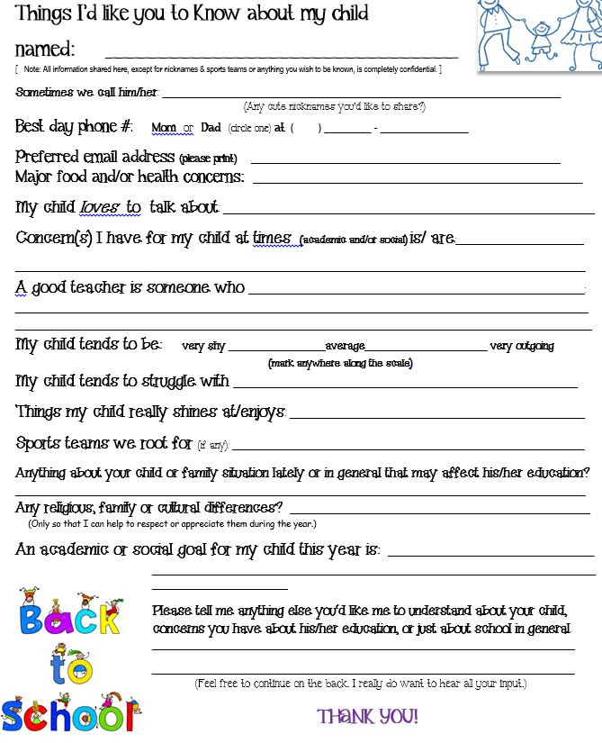 Here is the form I put together. I just used it for the first time. It has a good mix of questions probing for concerns while allowing children to boast and be rightfully proud of their child. My favorite question turned out to be: